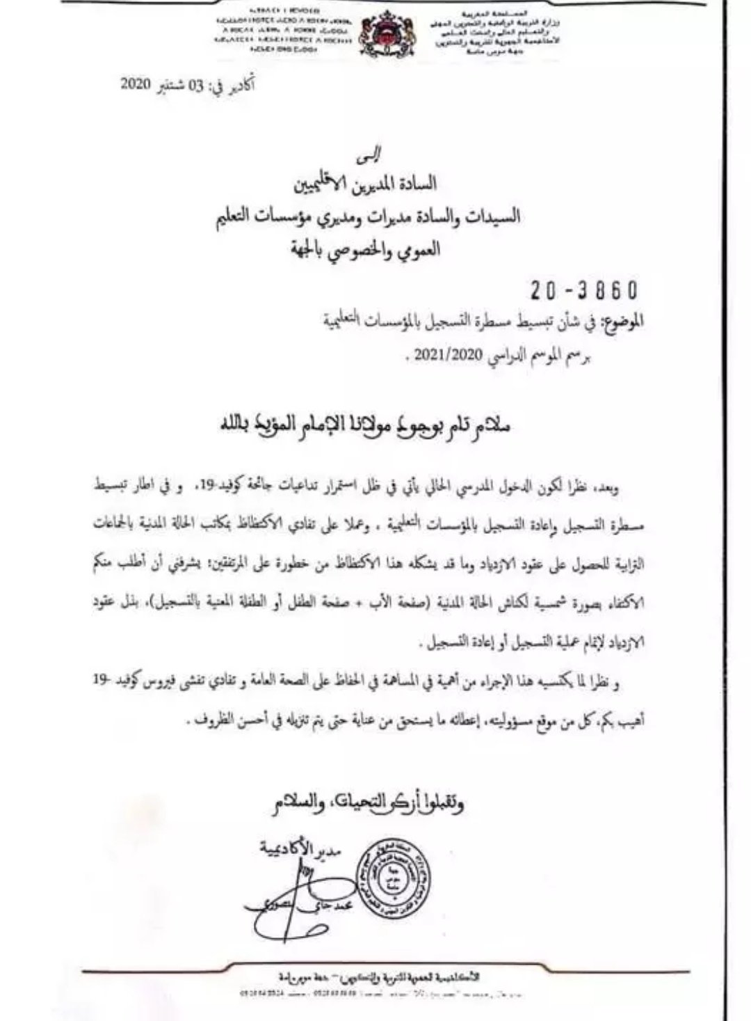في مراسلة موجهة الى السادة المديرين الاقليميين و مديرات ومديري مؤسسات التعليم العمومي والخصوصي بالجهة، قررت الأكاديمية الجهوية للتعليم بجهة سوس ماسة الإكتفاء بصورة شمسية لكناش الحالة المدنية بدل عقود الازدياد، من أجل تسجيل التلاميذ الجدد وإعادة التسجيل بالنسبة للتلاميذ القدامى.
