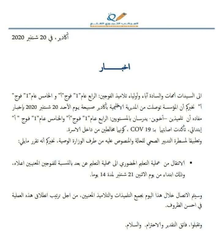 وفور توصلها صبيحة اليوم الاحد 20 شتنبر، بإخبارية من المديرية الاقليمية بأكادير عن النتائج المخبرية للأخوين المصابين، قررت إدارة المؤسسة إصدار بلاغ توصلت بلوس24 بنسخة منه تأكد فيه، الانتقال من عملية التعليم الحضوري إلى التعليم عن بعد بالنسبة للفوجين المعنيين، وذلك ابتداء من يوم الاثنين 21 شتنبر 2020، لمدة 14 يوما.