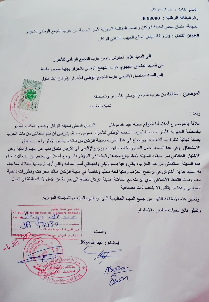 بعد أن توجه حاميد البهجة المنسق الجهوي لحزب الاحرار بسوس، للرأي العام ببلاغ يسرد فيه تفاصيل وأسباب اقالة المنسق المحلي لحزب التجمع الوطني للأحرار بمدينة إنزكان، خرج موكال عبد الله عن صمته ووجه هو الأخر بلاغ للرأي العام ووجه رسالة خاصة للأمين العام للحزب عزيز أخنوش، وفيما يلي نص البلاغ: