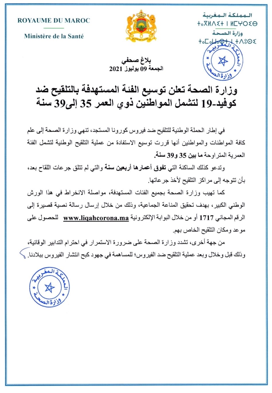 وأوضحت وزارة الصحة، في بلاغ لها، توصّل “سيت أنفو” بنسخة منه، أنها قرّرت توسيع الاستفادة من عملية التلقيح الوطنية لتشمل الفئة العمرية المتراوحة ما بين 35 و39 سنة.