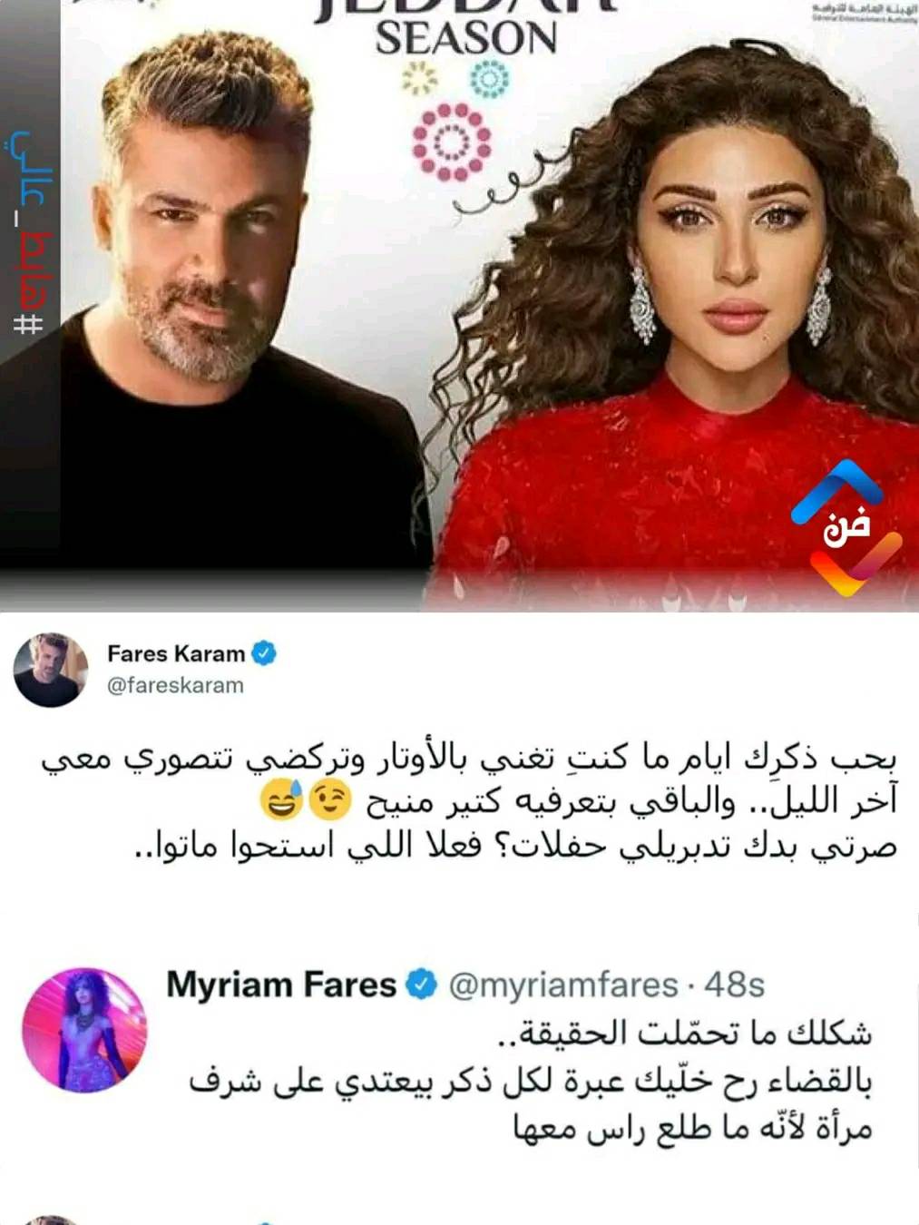وكان فارس قد رد على مقابلة صحافية لميريام، قالت فيها إنها هي من توسط لكرم للاشتراك معها في حفلها، بكتابة تغريدة مهينة على “تويتر”، مضمونها أنها كانت تلاحقه بعد حفلاته لتتصور معه، ولمح إلى أمور لا أخلاقية، واستخدم “هاشتاع” زمن الرقاصات، وهاشتاغ آخر مهين لميريام، التي سبق أن رفضت الرد على إهانة له قالت إنها لن تنحدر إلى هذا المستوى.