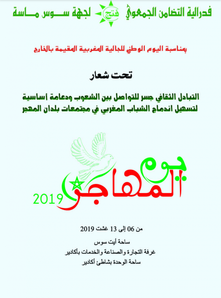 احتفالا باليوم الوطني للجالية المغربية المقيمة بالخارج، تنظم فدرالية التضامن الجمعوي بجهة سوس ماسة تظاهرة يوم المهاجر في دورته الخامسة في الفترة الممتدة من 06 إلى 13 غشت 2019.