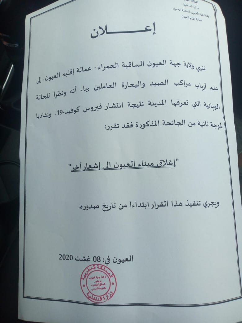 قررت ولاية جهة العيون الساقية الحمراء، إغلاق ميناء العيون إلى إشعار أخر.