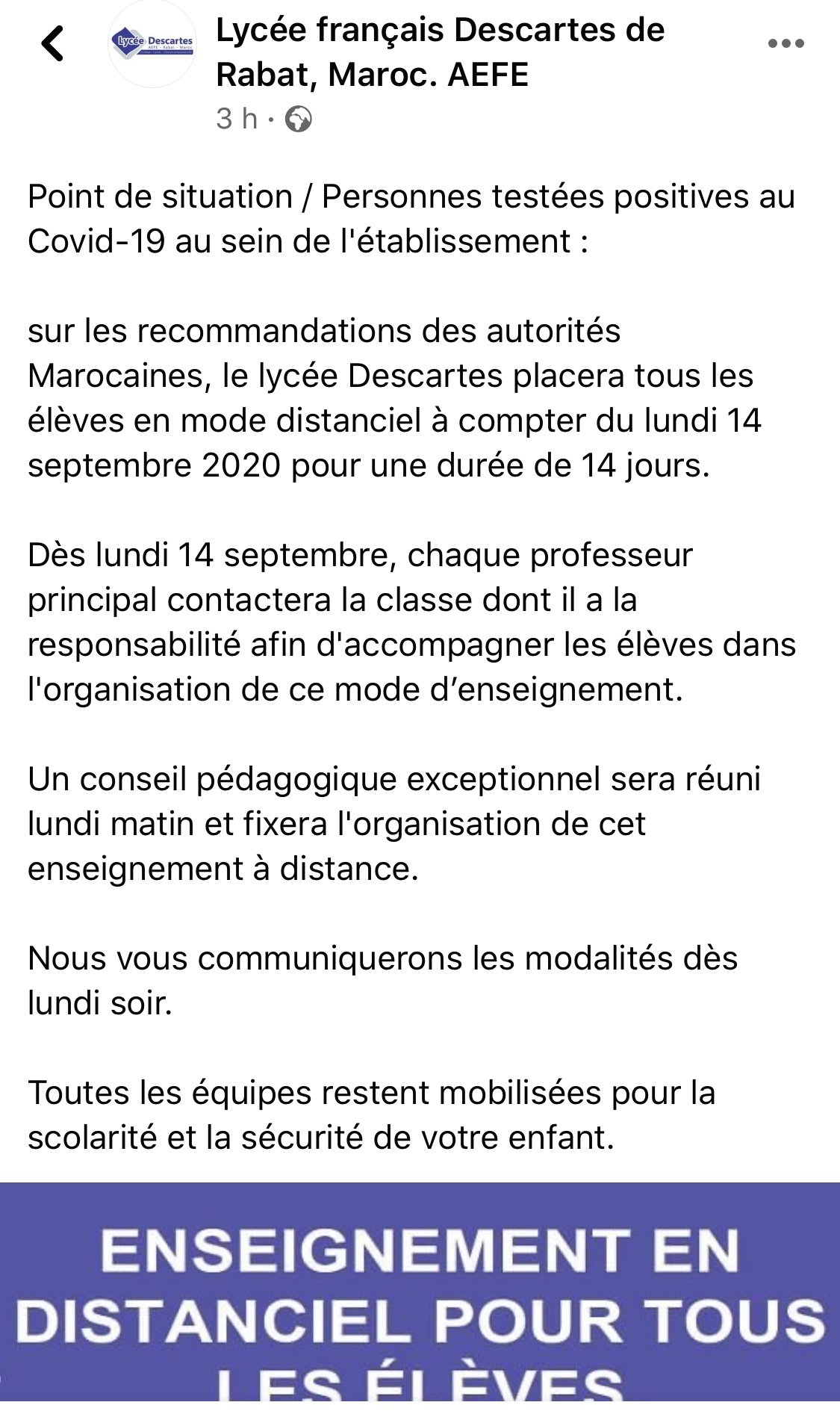 أفاد بلاغ صادر عن إدارة المؤسسة التعليمية ثانوية ‘ديكارت’ التابعة للبعثة الثقافية الفرنسية بالرباط، بأنه تقرر تغيير نمط التعليم من الحضوري إلى التعليم عن بُعد بكافة الأسلاك التعليمية، مشيرا، بأن التلاميذ والطلبة الذين يتابعون دراستهم بالمؤسسة مطالبون بداية من الاثنين 14 شتنبر الجاري البقاء في منازلهم، لمتابعة دراستهم عن بُعد لفترة 14 يوم.