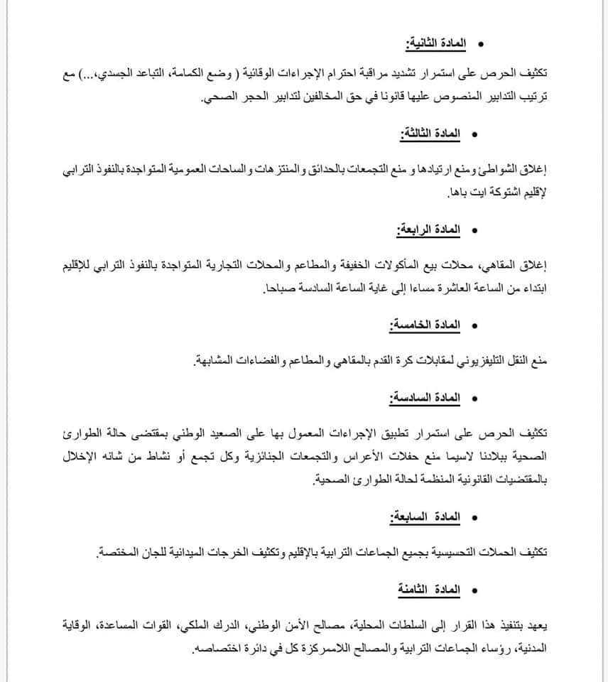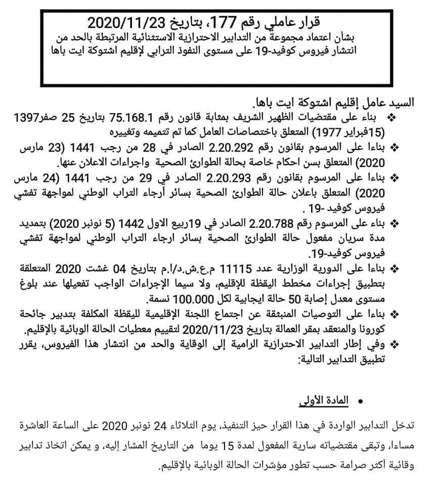 تم إعتماد مجموعة من التدابير الإحترازية الإستثنائية للحد من إنتشار فيروس كورونا بعد أن أصدر عامل إقليم اشتوكة أيت باها قرارا عامليا رقم 177 والصادر اليوم 23 نونبر الجاري . وجاء في القرار مايلي: