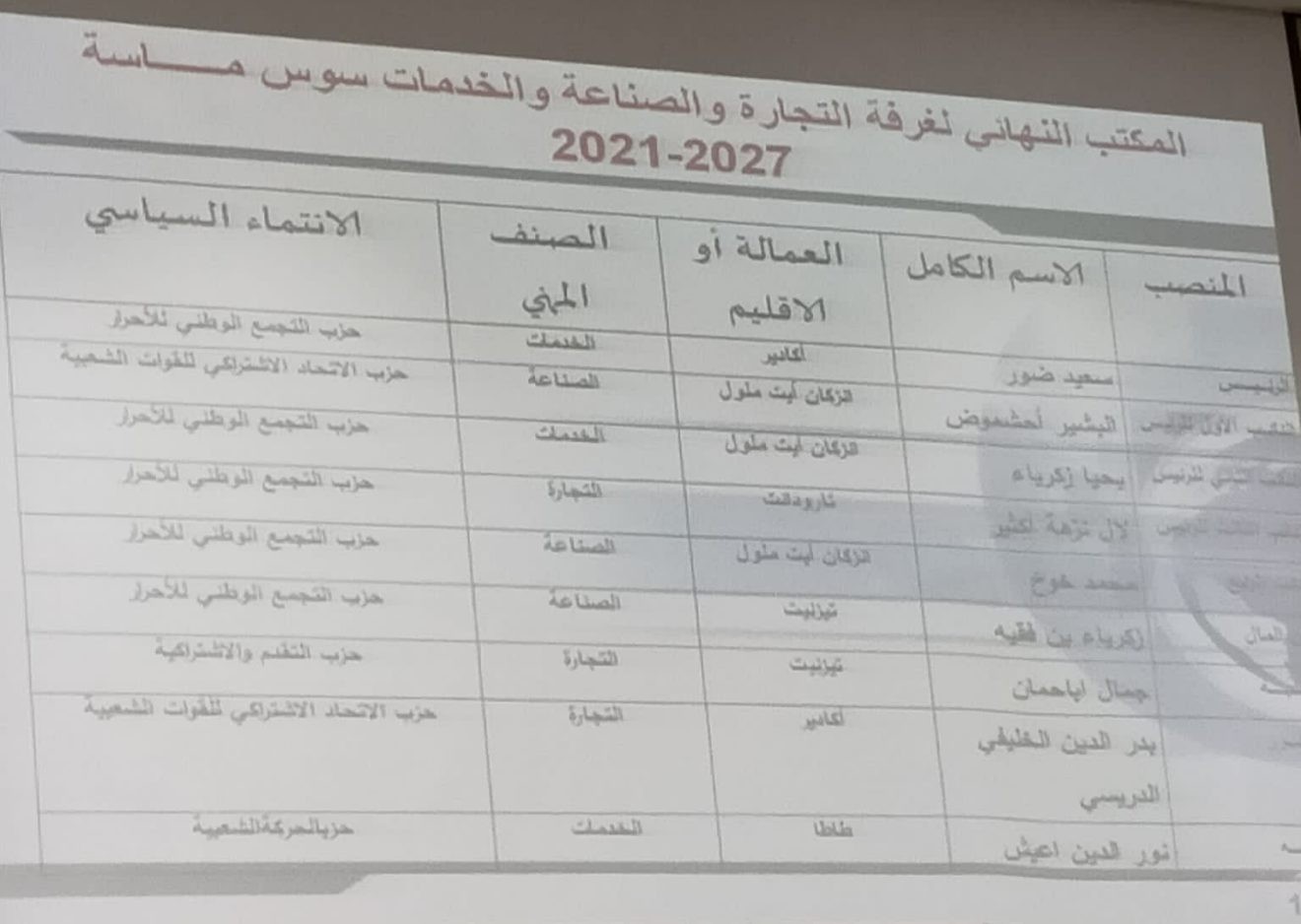 وقد حصل رئيس الغرفة على أصوات اعضاء التجمع الوطني للاحرار والاتحاد الاشتراكي والتقدم والاشتراكية والحركة الشعبية، بالإضافة إلى بعض اعضاء المنتمون لحزب الاستقلال، رغم أن هذا الأخير أعلن عن تحالف بينه وبين البام في مواجهة هيمنة حزب الاحرار على نتائج الغرف المهنية بسوس.